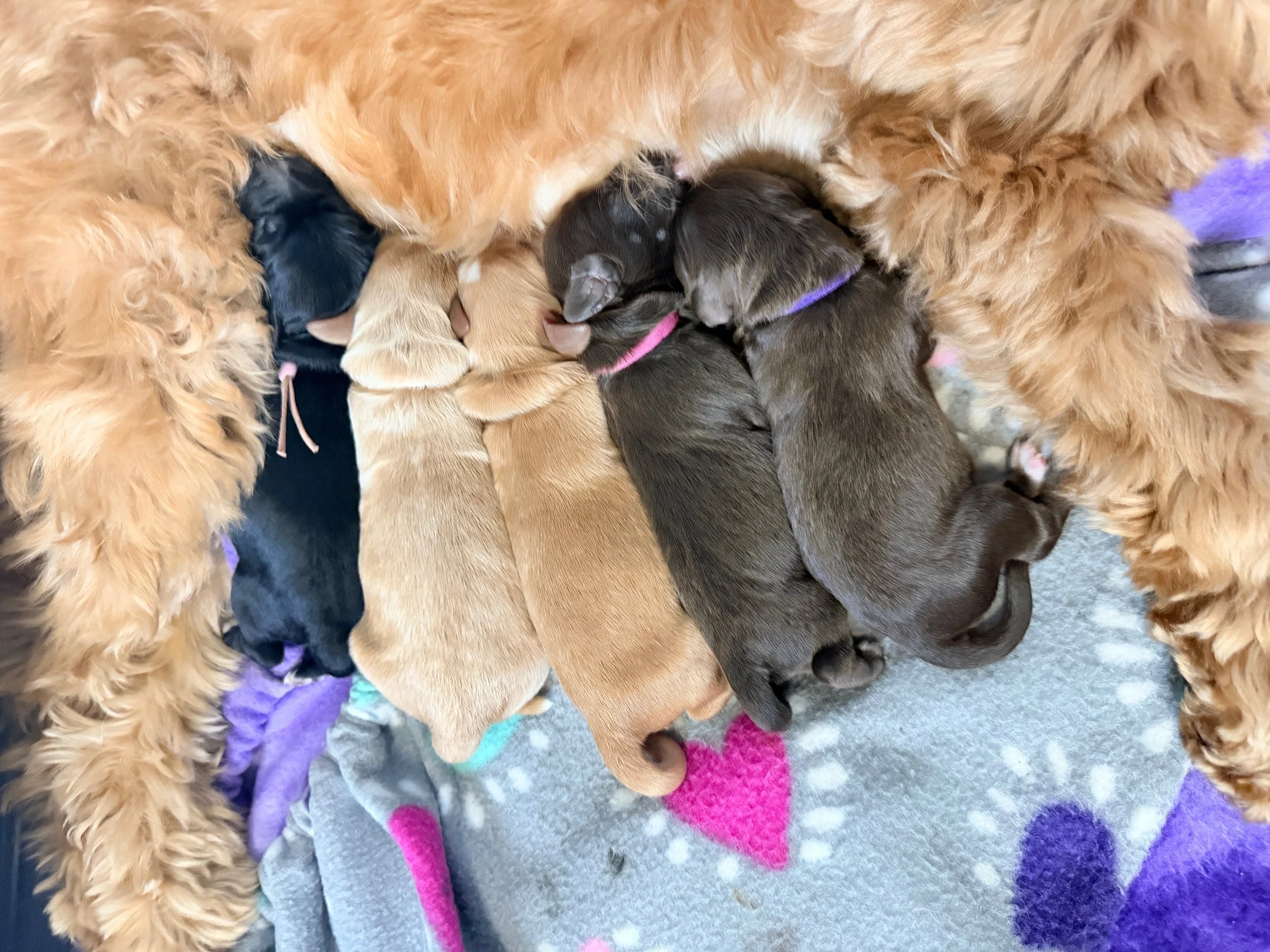 We are a proud Gold Paw member of the ALAA, Australian Labradoodle Association of America. As a member of the ALAA, we are required to maintain outstanding breeding practices. We can assure you that our breeding choices are done after extensive research and testing of both the mamas and papas to maintain and improve the extraordinary health, temperament and pedigree that Multi-Generational Australian Labradoodles are known for. Once the puppies are born, let the loving and cuddling begin. At birth we start the Puppy Culture program. This program is followed until the day they are carried off in your loving arms to join your family. Early Neurological Stimulation, ENS, is started at 3 days old and continues daily through 16 days old. ENS is proven to aid in the desensitization processes. Temperament is both genetics and learned behavior. We’ve carefully matched the breeding pairs for the genetics and to help with their learned behavior we lovingly spend hours working on skillsets. These skillsets include but are not limited to: noise desensitization, exploring the big outdoors, manding, introduction to crate and potty training, car rides, alone time away from siblings and an ABUNDANCE of socialization.